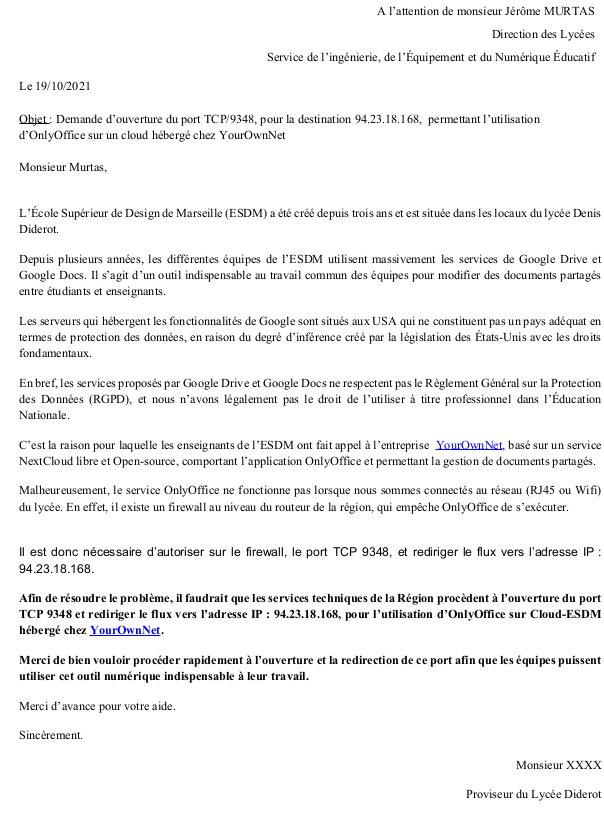 La demande d'ouverture de ce port ne peut être effecfuée que par le chef d'établissement, auprès des services techniques en charge du réseau informatique de la région : "Direction des Lycées, Service de l’ingénierie, de l’Équipement et du Numérique Éducatif". Une lettre de demande officielle doit être signée par le chef d'établissement et transmise au responsable en question via le technicien réseau de l'établissement.