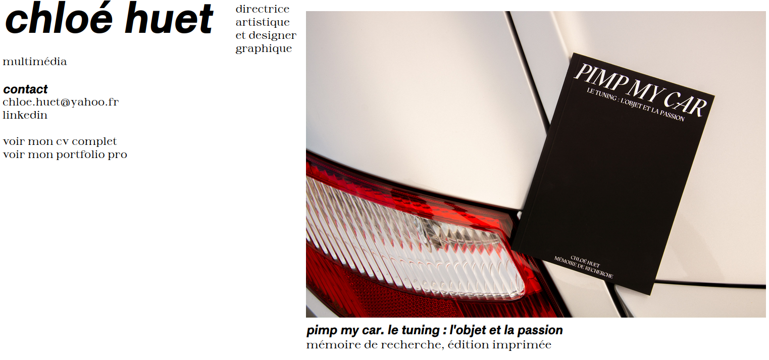 Un site professionel réalisé par une étudiante de DSAA Design Graphique et Narration Multimédia de Boulogne,Chloé Huet. Vous pouvez télécharger une version allégée ne contenant que 2 pages projets...