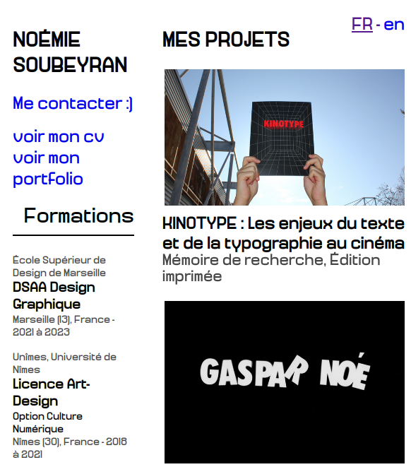 Un site professionel réalisé par Noémie Soubeyran en DSAA2 Design Graphique à l'ESDM en 2022-2023. Vous pouvez télécharger une version allégée ne contenant que 2 pages projets...