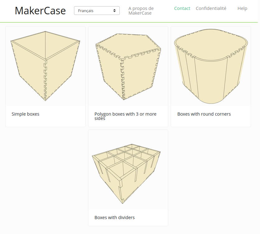 Logiciel en ligne permettant d'obtenir les plan de fabrication de différentes boites (simples, fermées, ouvertes, polygonales, à bords ronds, à encoches, boites de rangements, etc.)