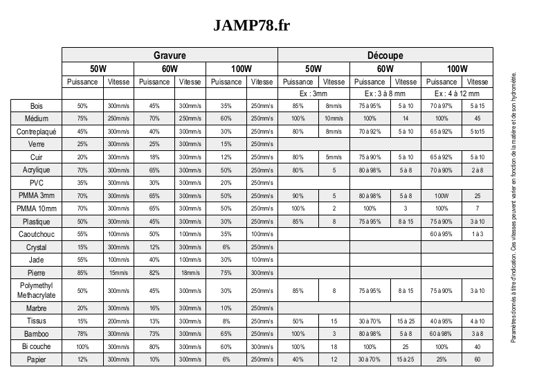 Document partagé permettant de répertorier les réglages de puissance et vitesse pour différents matériaux.